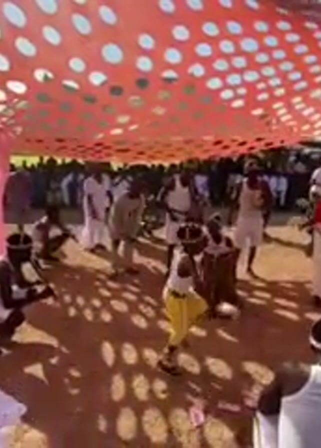 The video depicts a gathering of people under a large, orange canopy with circular cutouts. Several individuals are dressed in white attire, while others wear more colorful clothing, including yellow pants. Some are dancing or performing movements, accompanied by musicians playing instruments. The ground appears to be covered with dry grass or dirt. The event seems to be taking place outdoors on a sunny day, with a crowd of onlookers visible in the background. There are pink decorations surrounding the main gathering area.