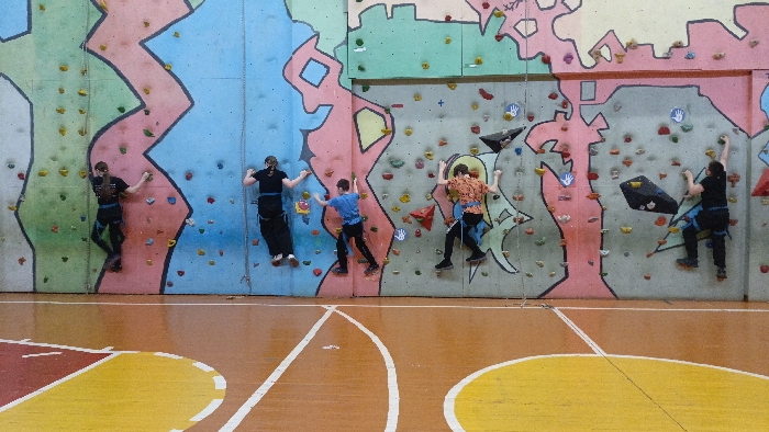 The image displays an indoor climbing wall located within a sports facility in Sarapul, Russia