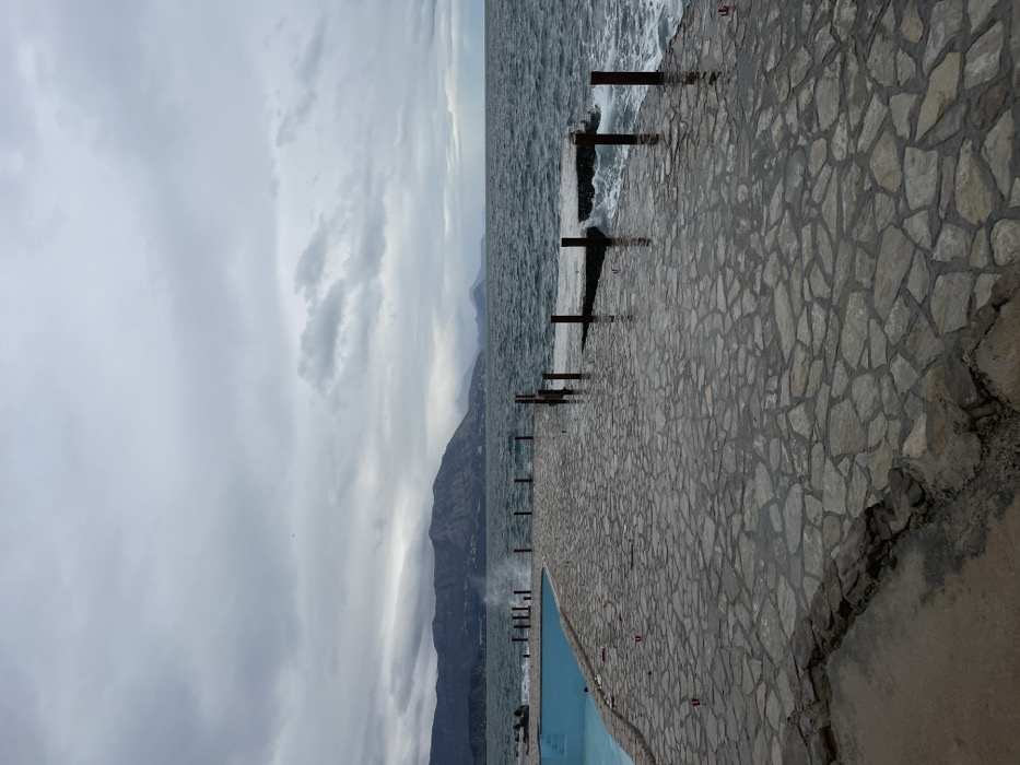 Location: Prijevor, Montenegro. The image displays a coastal environment under heavily overcast conditions. The sky is entirely covered by multiple layers of grey clouds, indicating a lack of direct sunlight. The sea is turbulent, characterized by dark blue-green water and visible whitecaps and foam from wave action. In the foreground, a wet, irregularly shaped stone-paved surface, approximately 6 meters wide at its nearest point, occupies the lower half of the frame. This paving transitions from a slightly rougher, darker concrete section at the bottom left. To the immediate left, a light blue swimming pool is partially visible, its water level appearing full. Small, reddish-orange cap-like objects are sparsely positioned along the outer edge of the pool. The stone paving extends seaward, forming a pier or walkway. Along the right edge of this structure, approximately six dark, weathered vertical posts or pilings are embedded, some partially submerged by the rough water. A section of the pier's edge on the right side appears broken or lower, allowing waves to actively wash over it. A significant splash of white water, indicative of a large wave breaking, is visible near the left side of the pier, just beyond the far end of the pool. In the background, a dark mountain range stretches across the horizon above the sea. No human figures, active vessels, or other distinct moving subjects are present in the scene.