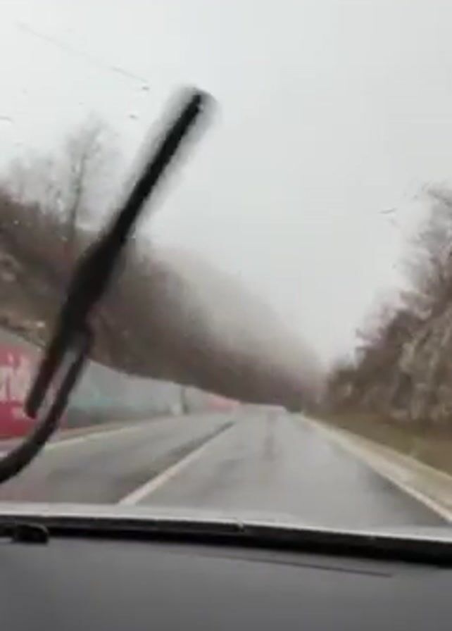 The video is a point-of-view shot from inside a car driving on a wet, paved road. The car's windshield wipers are active. The road curves slightly and is surrounded by hills, some covered in trees. The visibility is poor due to dense fog. A concrete barrier lines part of the road, featuring pink, red, and white graphics, possibly advertisements. A road sign is visible, warning of a curve. The overall atmosphere is gray and overcast due to the weather.