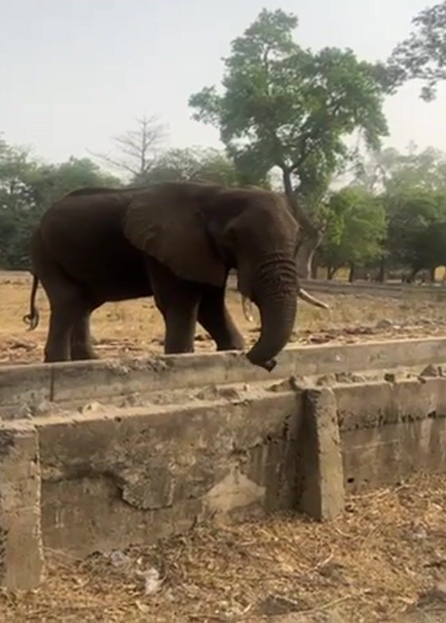 n elephant standing near a concrete structure in what appears to be a park or sanctuary. The elephant is large, with dark gray skin and white tusks. It is standing in front of a long, rectangular concrete structure that may be a water trough or a barrier. The ground is dry and covered with grass and fallen leaves. In the background, there are several green trees and a hazy sky. The elephant is facing the camera, and its trunk is reaching down towards the concrete structure, possibly searching for water.