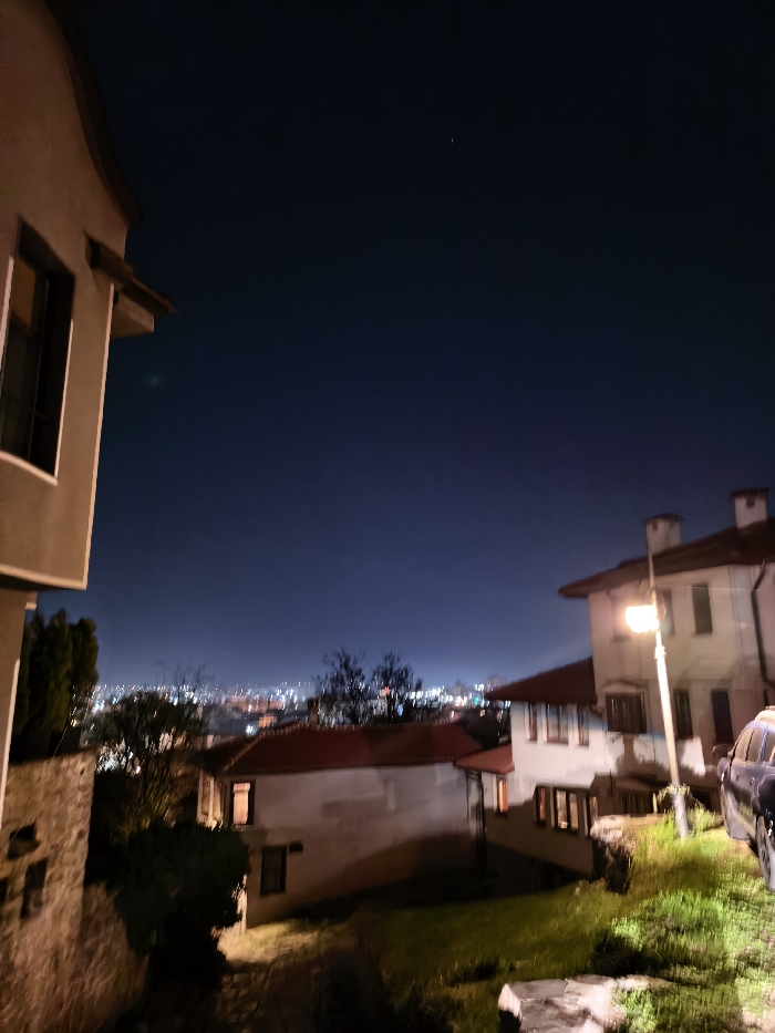 The image depicts a nighttime urban scene in Plovdiv, Bulgaria, observed from an elevated position. In the immediate foreground, to the left, is the corner of a light-colored building with a distinct curved roofline element and a dark rectangular window. Below this, a stone wall and dense, dark vegetation are visible. To the right, another light-colored, multi-story building with a reddish-brown tiled roof and two chimneys is prominent. A tall street lamp, positioned in front of this building, emits a warm orange light, illuminating a section of grassy ground and part of a dark-colored vehicle, likely an SUV, parked on an incline on the far right. The mid-ground features several other residential structures with reddish-brown tiled roofs, some exhibiting faintly lit windows, suggesting houses on a hillside. Sparse, leafless trees and shrubs are scattered across the terrain. Beyond these structures, a wide expanse of city lights from the broader urban area of Plovdiv is visible stretching across the horizon, appearing blurred and distant. The sky above is dark indigo to black, clear, with a single, distinct white point, consistent with a star or planet, visible in the upper central portion of the frame. No individuals or specific actions are discernible within the scene.
