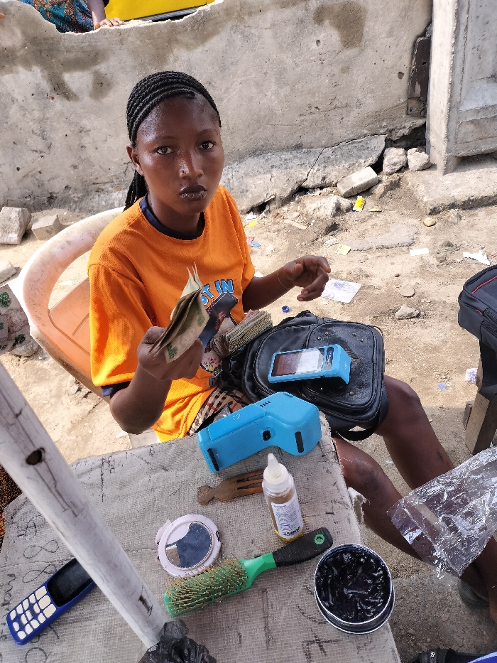 A young woman with braided hair and an orange t-shirt sits on a white plastic chair in an outdoor setting in Alagbede, Nigeria. She faces the camera directly, holding a stack of Nigerian Naira banknotes in her left hand, while another larger stack rests on her lap beside a black shoulder bag. On her lap, a blue Point-of-Sale (POS) terminal and another smaller electronic device are visible on the bag. To her left, a light-colored makeshift table surface displays various items: a blue portable electronic device, a brown wooden hair clip, a clear dropper bottle containing light brown liquid, a white compact mirror, a green and black hairbrush with metallic bristles, an open black tin of dark gel-like hair product, a blue feature phone, and crinkled aluminum foil. The ground is unpaved, consisting of dirt and small debris, with a worn concrete wall visible in the background. Partial view of another person is visible in the upper left background.
