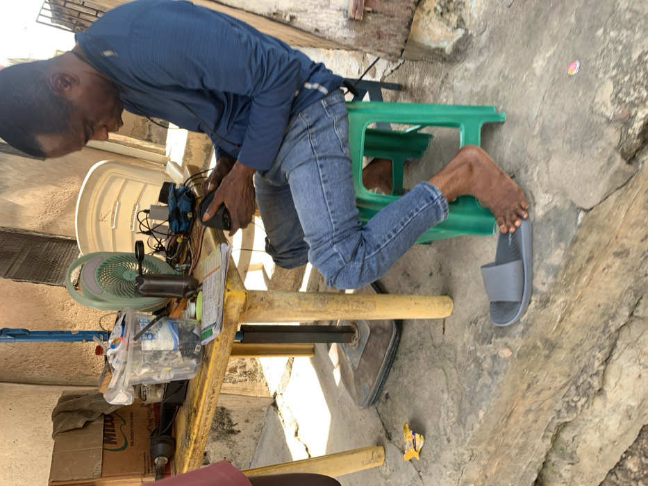 In Adankolo, Nigeria, an outdoor scene shows a dark-skinned adult male seated on a green plastic stool, facing right