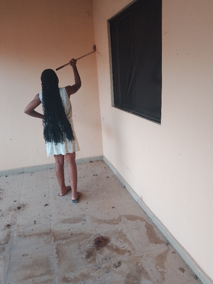 A young woman with long, dark braids stands on a tiled floor, holding a stick and seemingly cleaning the wall. She wears a light-colored dress and sandals. The floor is stained and dirty with debris. A window with a dark screen is visible on the right wall. The walls are painted in a muted, warm color.