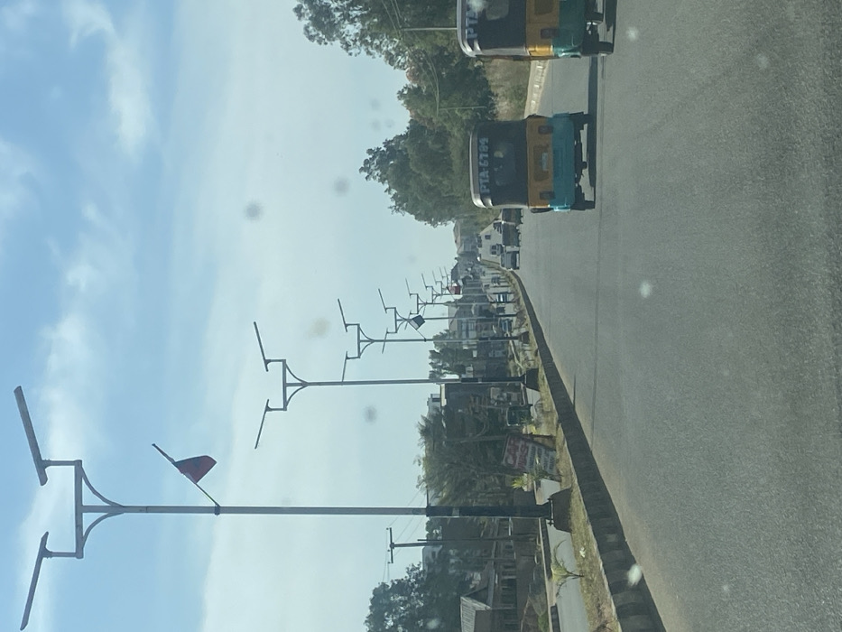 The image depicts a straight section of a multi-lane asphalt highway in Unknown, Unknown, viewed from inside a moving vehicle. The sky is light blue with scattered white clouds. The road features a raised concrete median strip lined with solar-powered streetlights. Each streetlight has a T-shaped top supporting solar panels. A reddish-purple flag, displaying a black double-headed eagle emblem, is affixed to one of the streetlights on the left side of the median in the foreground. In the right lane, two three-wheeled motor vehicles, yellow and turquoise in color, are traveling away from the viewer. The rear vehicle displays the alphanumeric identifier "PTA-6789" on its back. Further down the road, additional vehicles, including cars and vans, are visible, also heading away. To the left of the road, beyond the median, utility poles with overhead lines are present, along with a "CAR WASH" sign propped on the median. Buildings are visible in the background on the left. The right side of the road is bordered by dense tree cover and utility poles. No individuals are clearly discernible. The scene is illuminated by daylight.
