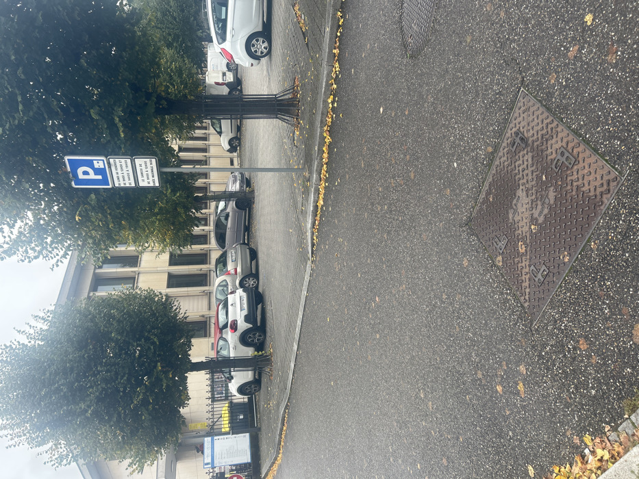 The image displays an outdoor urban scene in Hoenheim, France, under an overcast sky, with scattered yellow-orange autumn leaves on the ground. In the foreground, a dark gray asphalt road surface features a square, textured metal utility access cover in the lower right. A raised curb separates the road from a paved parking area in the midground. This area contains multiple parked vehicles, including a white Citroën C3 with a red roof (license plate FP-927-WX), a silver hatchback, a dark gray sedan, and a white van, among others. Two deciduous trees with green foliage stand in the paved area, one equipped with a metal trunk guard. A blue parking sign on a pole displays white text detailing French parking regulations, specifying restricted hours from Monday to Friday (09h00-12h00 and 14h00-19h00) and on Saturday (09h00-12h00) with a maximum duration of one hour. A yellow refuse bin and a white information board are partially visible behind a metal fence on the left side of the parking area. The background is dominated by a light-colored, multi-story building with numerous windows, indicative of an institutional or office structure. No individuals or specific actions are depicted within the scene.