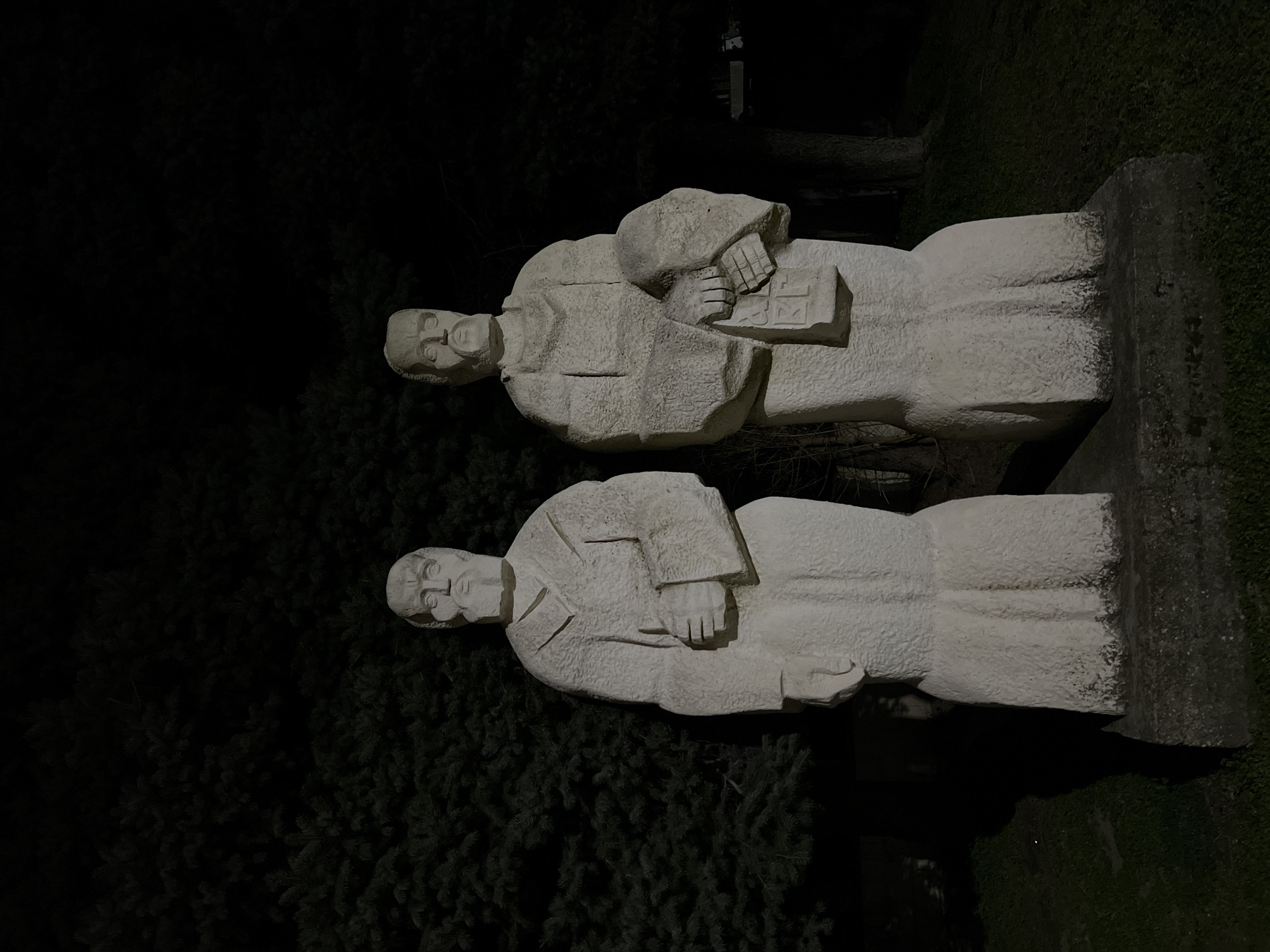 - "Two illuminated stone statues of male figures stand erect at night in Rakovski, Bulgaria" by FM-yFnm82, licensed under CC BY 4.0