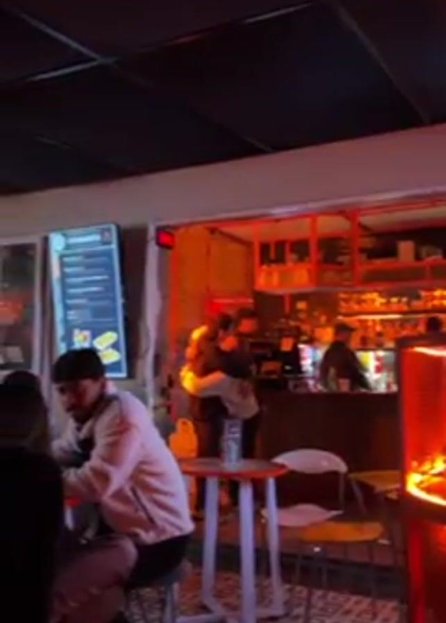 bustling bar setting. People are seated at tables, engaged in conversations. Some individuals are embracing near the bar area, where staff are working. The bar features bright lighting and a menu display. The overall atmosphere suggests a lively social gathering.