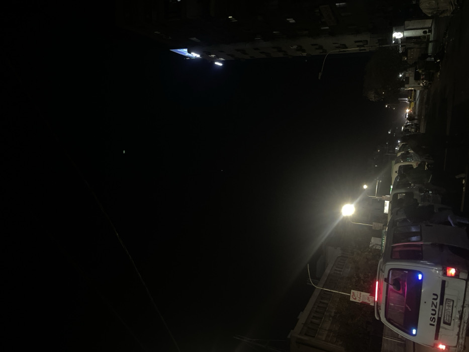 A night street scene. A multistory building is visible at the top, illuminated by its own lights. A row of vehicles is parked along the right side. Streetlights cast bright glows along the street. One vehicle is an Isuzu pickup truck. The sky is dark with a few distant illuminated details. A power line extends diagonally across the scene.