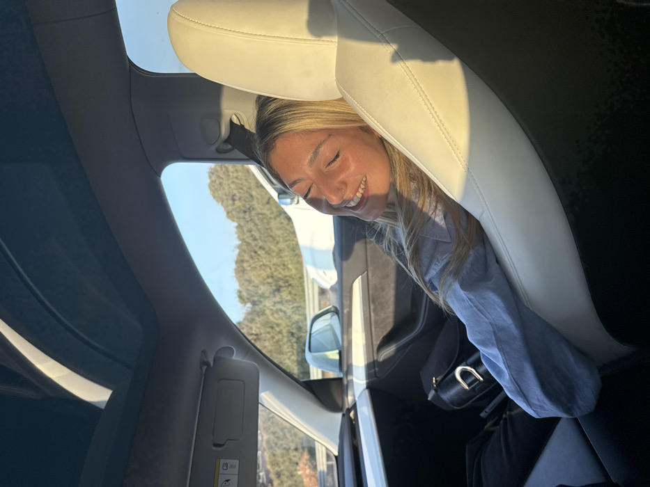 The scene depicts the interior of a vehicle in the city of Jaljulia, Israel. A female individual with light-colored hair, wearing a light blue long-sleeved shirt and dark pants, is seated in the front passenger seat. She is observed smiling with her eyes closed, her head tilted slightly back and resting against the light-colored leather headrest. Direct sunlight illuminates her face and the passenger seat. A small metallic nose ring is visible on her right nostril. The vehicle interior features a light-colored leather passenger seat and dark dashboard/door trim. A black handbag with a silver buckle rests on the floorboard near the passenger's feet. Above, a panoramic glass roof is visible, along with a front sun visor displaying an airbag warning label. Through the passenger window, a clear blue sky is visible above a landscape of green trees and bushes on an incline. A section of a light-colored vehicle is partially visible outside the window, adjacent to the described car. The lighting is natural and bright, indicative of daylight.