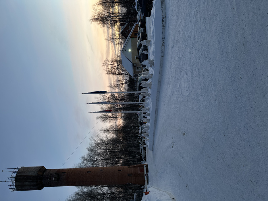 The scene depicts a snow-covered outdoor area in Старт-2 Снт, Russia, at what appears to be either dawn or dusk. The sky above transitions from a pale blue directly overhead to soft yellow, orange, and pink hues near the horizon line on the right. The ground is uniformly covered in a layer of white snow. To the far left, a tall, cylindrical water tower constructed of red brick rises prominently, featuring a concrete top section with a metal railing and communication antennae. A thin, dark cable or wire extends diagonally downwards from the upper portion of the tower. At the base of the tower, a horizontal red and white barrier arm is visible. In the mid-ground, a wide, snow-covered path or driveway leads into the scene from the foreground. To the right of this path, a raised, snow-covered median or planter is adorned with approximately twelve white, conical snow sculptures, resembling abstract figures or gnomes, spaced evenly along its length. Behind these snow sculptures, a line of four flagpoles stands upright. The leftmost flag is identifiable as the Russian national flag (red, white, and blue). The other three flags are lighter in color and less distinct. Beyond the flagpoles, a parking lot contains numerous parked vehicles, predominantly dark-colored sedans and SUVs, all lightly dusted with snow. Further in the background, behind the parking lot, a small, single-story building with a dark sloped roof and a lit exterior light is visible. Partially obscured to its right is another building with a reddish-brown roof. Numerous bare deciduous trees, also dusted with snow, frame the mid-ground and background, extending across the scene from left to right. No individuals are present or visible within the frame.