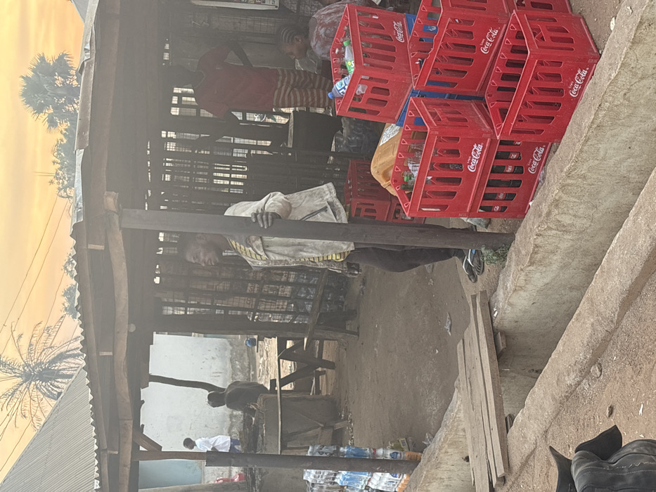A modest outdoor shop shows a man wearing a patterned shirt, leaning against a wooden support, looking towards stacked Coca-Cola crates. Behind him, another individual in red is near the back of the shop. The shop's structure is basic, with a corrugated metal roof and wooden framework. Palm trees and a hazy sky are visible in the background. The foreground features steps leading up to the shop and various scattered objects.