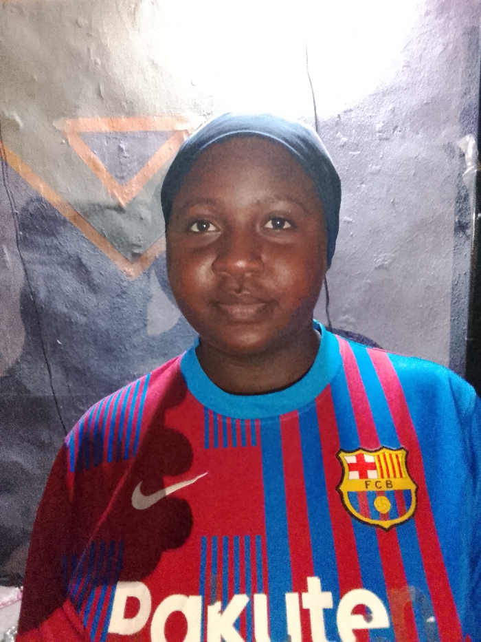A young woman with dark skin wears a head covering and a blue and red striped FC Barcelona jersey with a Nike logo and the word "Rakute" printed on it. She stands in front of a textured wall with a painted triangle. Her expression is neutral, and she looks directly at the camera.
