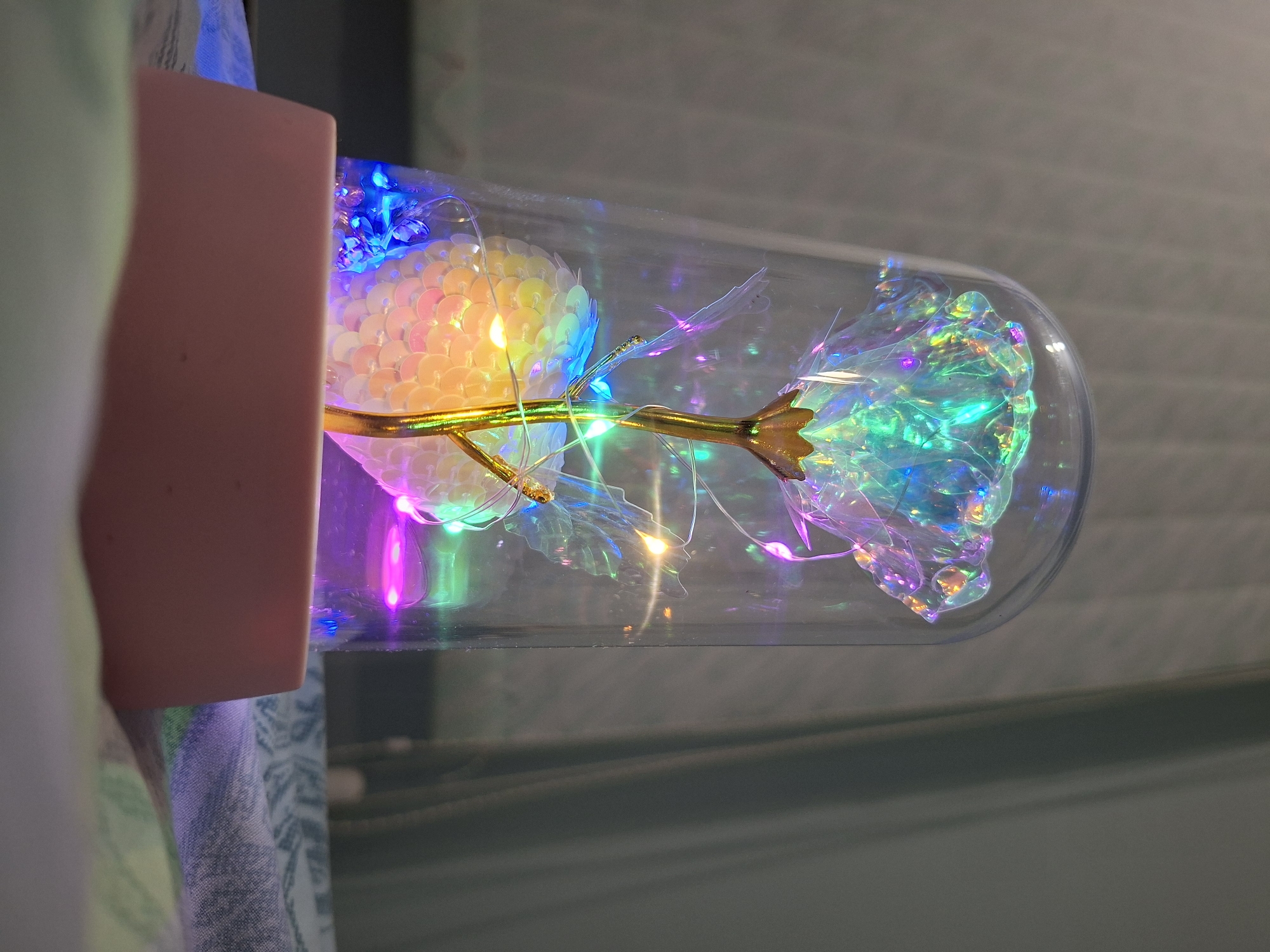 decorative rose encased in a clear glass dome or container, set against a background that appears to be a window with closed blinds. The rose has a metallic stem and iridescent petals that reflect various colors, including blues, purples, and greens. The base of the dome is attached to a pink rectangular object, possibly a stand. Fairy lights are interspersed within the glass dome, adding to the decorative effect. The overall scene is indoors, possibly a room in a house or apartment. The image does not contain information to confirm the location of the city of Nova Zagora, Bulgaria.