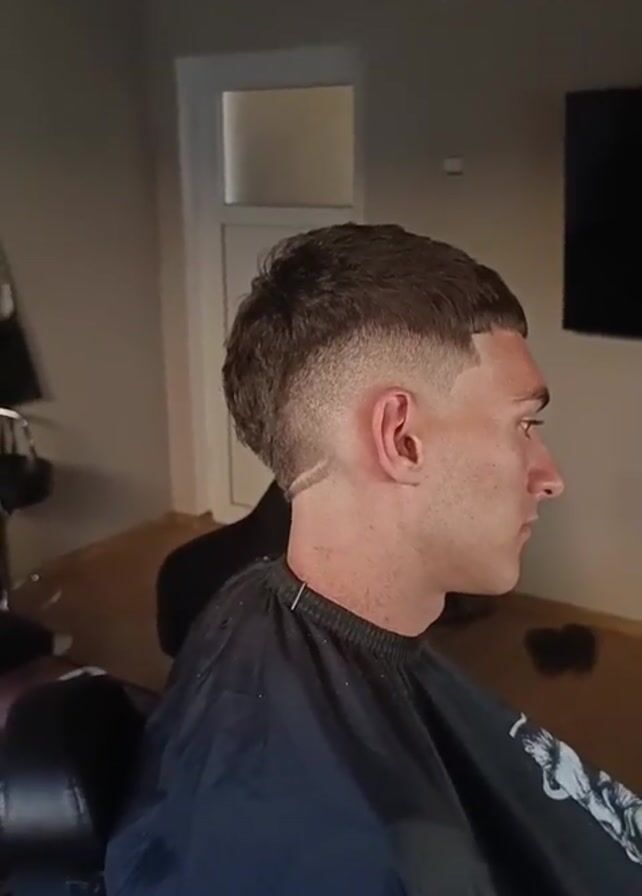 A young man is sitting in a barber's chair. He is wearing a black barber's cape. His hair is a short, textured style with a faded cut on the sides and back, and a line shaved into the hair on the side of his head. The barber shop looks fairly tidy, with a black chair, tiled floor, and white door in the background. There is a partially obscured sign on the wall reading "FOX". The camera appears to be handheld, and remains stationary. Music is playing.