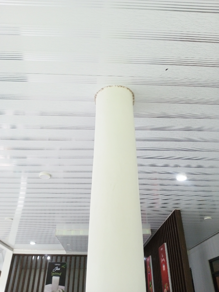 The image captures an interior view within a commercial establishment in Pachmarhi, India. A prominent cream-colored cylindrical column stands centrally, extending vertically from an unseen base to a white paneled ceiling. The ceiling features parallel grey lines and a subtle textured wave pattern, equipped with multiple recessed circular light fixtures, one of which is brightly illuminated. A dark, soiled ring is evident at the column's apex where it meets the ceiling. Partial views of dark brown slatted partitions are visible to the lower left and right of the column. A black promotional poster, depicting a glass of a white beverage and text "Jus Fresh," is affixed to the left partition. Two additional vertical red-orange posters are partially visible on the right partition. A dark framed opening, possibly a window or doorway, is visible in the far right background. No individuals or dynamic activities are observed.