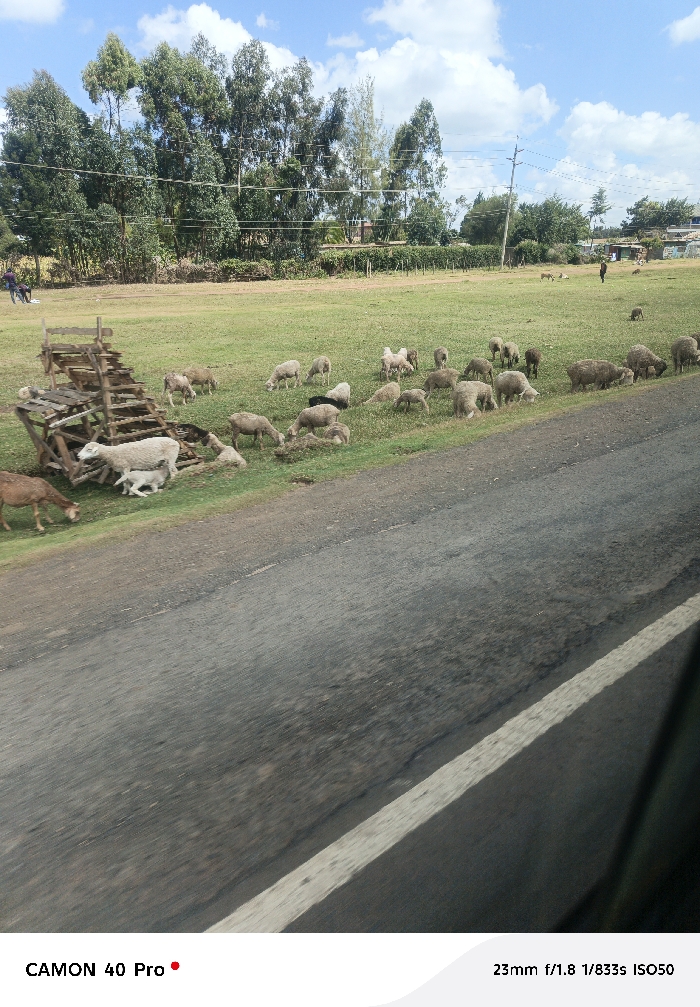 The image depicts a roadside scene in Kitengela ward, Kenya, characterized by a large flock of livestock grazing in a green, open field under a partly cloudy sky
