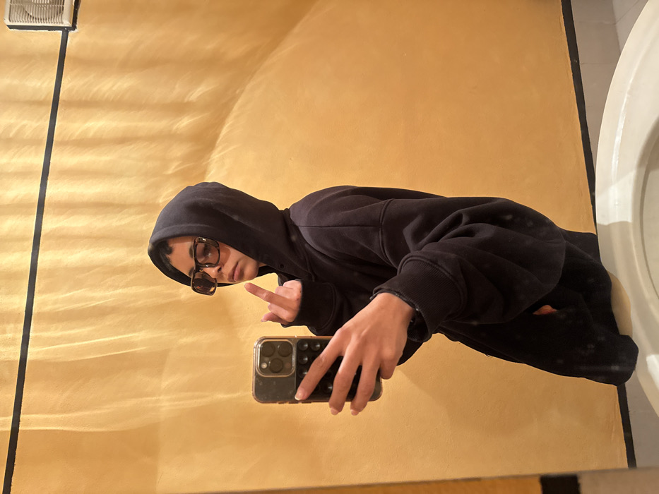 A person wearing a black hoodie and sunglasses is reflected in a mirror