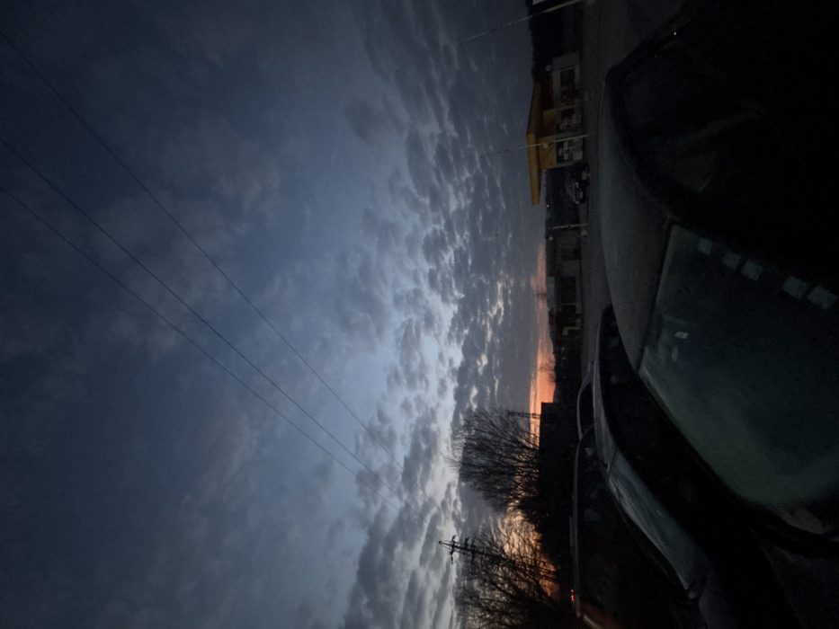 The image depicts a static outdoor scene in Sevlievo, Bulgaria, under low light conditions consistent with either dawn or dusk. The sky, occupying the upper two-thirds of the frame, is largely overcast with numerous small, uniformly shaped clouds, transitioning from dark blue-gray overhead to an orange-red glow at the horizon. Three thin power lines traverse the upper sky diagonally from left to right. In the foreground, the dark roofs and partial windshields of at least three parked vehicles are visible, positioned at an oblique angle to the viewer. The vehicle closest to the camera exhibits a surface film consistent with frost or dew on its windshield and roof. No individuals are present within or around these vehicles. The midground features silhouetted elements against the horizon. To the left, several bare deciduous trees and a utility pole or transmission tower are discernible. To the right, a commercial establishment, specifically a gas station, is prominent with its distinctive yellow canopy covering fuel pumps. Adjacent to the gas station are two dark, low-rise structures, appearing closed or disused. A single dark vehicle is parked near the gas station pumps. The background presents a dark, indistinct horizon, possibly outlining distant hills or the periphery of the city, against the last visible remnants of the orange sky. The overall environment appears deserted, with no human activity or interactions observed.
