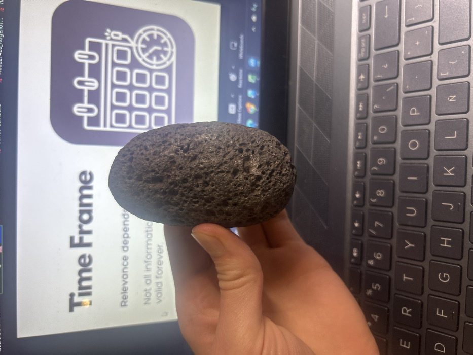 A hand holds a gray, porous volcanic rock in front of a laptop. The laptop screen displays a presentation slide with a "Time Frame" title and a calendar icon with a clock. Text on the slide indicates relevance and information validity. The laptop keyboard is visible to the right of the rock and the screen.