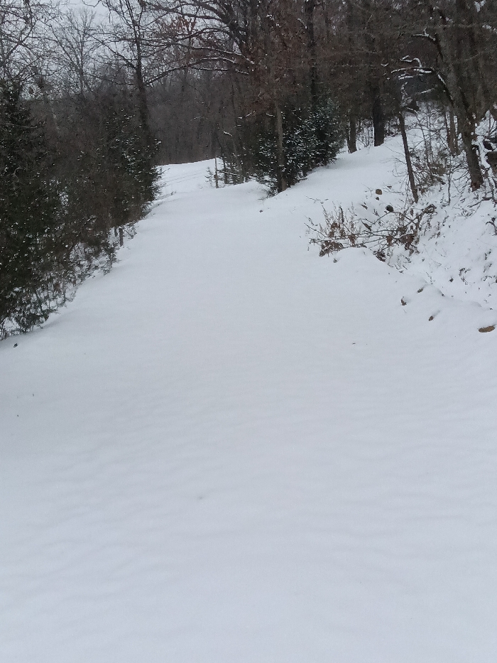 A snow-covered path winds through a wooded area. On either side of the path are trees, some bare and some with snow-covered evergreen foliage. The snow is deep and untouched in the foreground, showing a pattern of subtle drifts. The path leads gently uphill into the distance. The scene is overcast, contributing to a muted, wintery atmosphere.