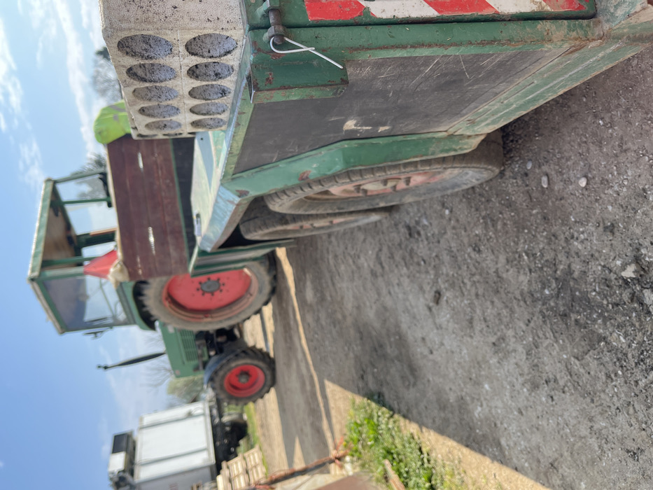 The image depicts an outdoor scene in Krško, Slovenia, likely a farmyard or industrial area, under clear daylight conditions. In the immediate foreground, to the right, is a green, multi-axle flatbed trailer with red wheel hubs and black tires. The trailer's side panels display wear, scratches, and dirt. Stacked on the trailer bed are at least two light-colored, rectangular concrete blocks, each featuring two rows of six circular perforations. A white metal hairpin cotter pin is visible on a latch mechanism at the rear right side of the trailer, which also has a red and white diagonal reflective safety stripe. In the midground, to the left of the trailer and out of focus, is a green agricultural tractor with large red wheels and a green cab enclosure. A red plastic object is positioned on the tractor's engine hood area. In the far background, further to the left and also out of focus, a portion of a white truck or semi-trailer is visible. The ground is an unpaved surface consisting of packed dirt and gravel, with various small stones and irregularities. Sparse, bare tree branches are visible against a clear blue sky in the upper background. No individuals are present in the scene.
