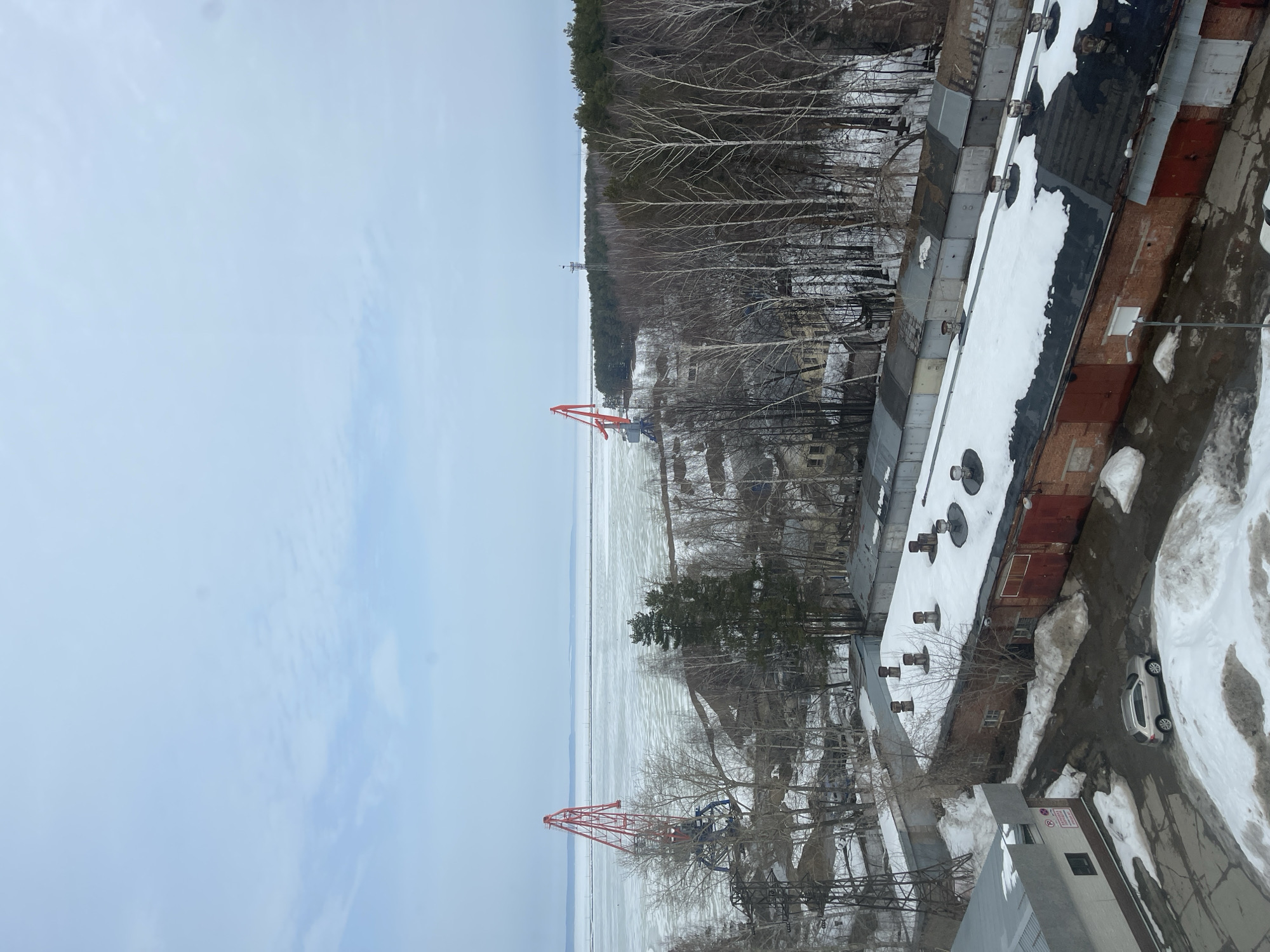 This elevated image depicts an urban-industrial landscape in Chaikovsky, Russia, during late winter or early spring. The foreground features a light-colored commercial building with a 'P' parking sign on its left side. A silver SUV is parked in an asphalt lot to the right of this building, surrounded by patches of dirty, melting snow. Adjacent is a long, red brick building with multiple red garage doors and a partially snow-covered dark roof from which several cylindrical vents protrude. To the immediate right, a row of smaller garages with varying colored metal doors and roofs, also partially snow-covered, is visible. The midground is characterized by a mixed forest of bare deciduous trees and interspersed evergreen pines, along with small, weathered structures and a tall metal lattice tower on the left. Further to the right in the midground, a slender, dark tower, possibly a navigation beacon or communication mast, stands before a denser section of evergreen trees. In the background, a vast expanse of partially frozen or ice-covered water, consistent with the Kama River or Votkinsk Reservoir, stretches across the horizon. Two prominent, large industrial cranes, primarily red and blue, are visible on the water's edge. A dark band of dense forest lines the distant shoreline to the right. The sky is uniformly overcast and light blue. No individuals are visible.