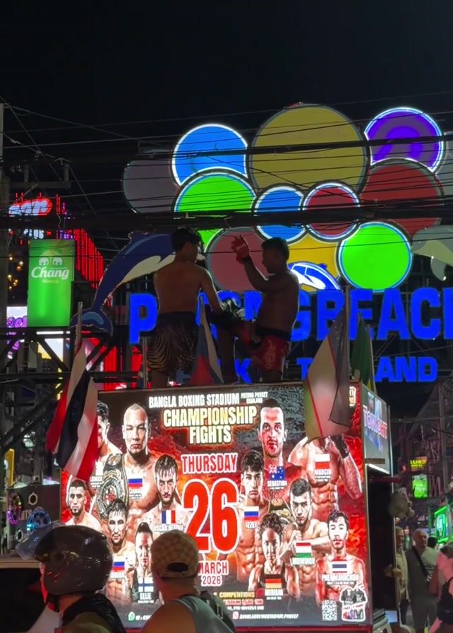 At night in Thailand, two shirtless boxers practice on a moving truck advertising Bangla Boxing Stadium Championship Fights. The truck is decorated with flags and posters of fighters, with the date listed as Thursday, March 26, 2026. Bright neon signs behind the truck read "Patong Beach Phuket Thailand". A person wearing a helmet stands near a scooter in front of the truck, while pedestrians walk on the sidewalk nearby.
