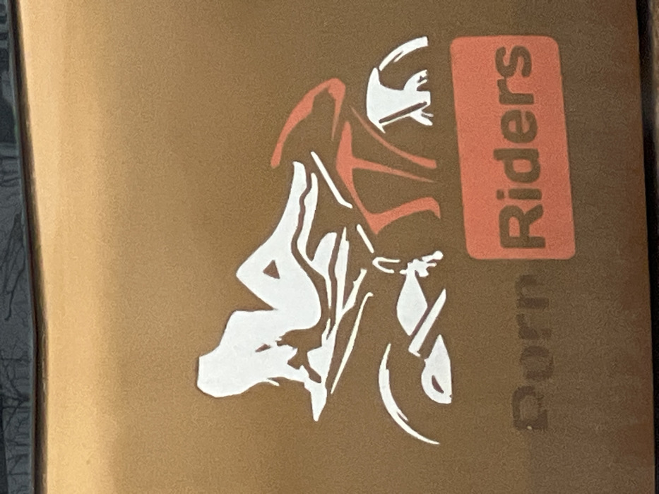 This image, originating from Shumen, Bulgaria, depicts a close-up of a decal affixed to a metallic bronze or coppery brown surface, consistent with a vehicle's body panel. The decal primarily features a white silhouette of a woman lying prone on a sport-style motorcycle. The woman is depicted with her head turned to the left, torso slightly raised, and legs bent, suggesting a state of undress or minimal clothing. The motorcycle itself is rendered in a minimalist white outline, with portions of the upper fairing and front area highlighted in a reddish-orange hue. Below the main graphic, the word "Porn" is faintly visible in a dark, semi-transparent font, positioned beneath the rear wheel of the motorcycle. Adjacent to this, the word "Riders" is prominently displayed in white capital letters within a rectangular reddish-orange box. The very top edge of the image shows a blurred dark line, likely the rim of a window or vehicle component, with faint, out-of-focus reflections of bare tree branches, indicating an outdoor setting. No individuals are directly visible in the immediate scene; interactions are not applicable.