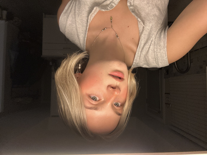 The image depicts a young female individual positioned in the foreground of an indoor setting. She has short, straight blonde hair, fair skin with visible freckles across her nose and cheeks, and light-colored eyes. A reddish blush is present on her cheekbones. She wears a small silver nose ring in her right nostril and multiple earrings in her left ear, including a hoop with a white pearl drop and a chain-style earring. A thin necklace with small beads and a green-yellow pendant is visible around her neck. She is wearing a light gray, ribbed, short-sleeved top with a partial button placket. Her left arm is raised and partially visible in the lower left foreground. Her gaze is directed slightly upwards and to the left. The background is dimly lit and largely underexposed. On the left, a stainless steel faucet or handle and a sink area are partially discernible, along with a textured wall. On the right, a white cabinet or dresser with drawers is visible in the mid-ground, beyond which a dark doorway or hallway is implied. The specific location within Vancouver, Canada, cannot be determined from the visual information present in the image.