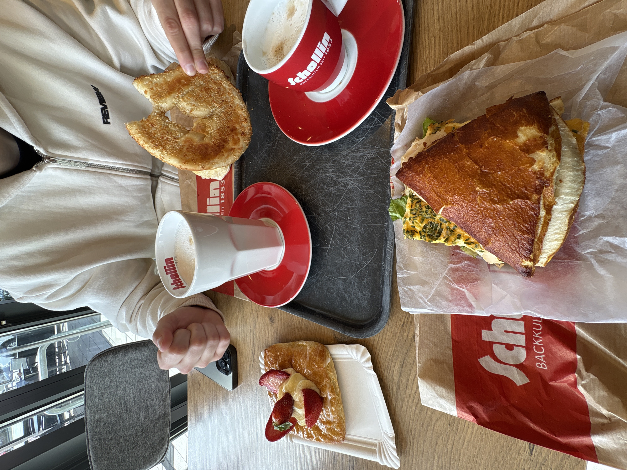 An eye-level shot looking down on a wooden table with a person, food, and beverages, taken at a Schollin bakery in Mönchengladbach, Germany. A person wearing a white jacket with the word "REVIEW" on the upper left, is holding a piece of sesame-seed bread with a bite taken out of it. A red cup and saucer are on a black tray, containing a foamy beverage. Beneath the tray is another similar red cup and saucer with a beverage. A cut sandwich in a brown and white paper wrapper and bag with a Schollin logo is visible. A pastry with sliced strawberries sits on a white paper plate. The person's hand is holding a black smartphone. A partial view of a black chair is in the bottom left.
