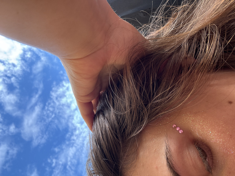 A close-up, low-angle shot shows a person’s face, mostly forehead and eye, adorned with glitter and three pink jewels. A hand rests on their head, possibly adjusting hair. The background reveals a bright blue sky with fluffy white clouds, creating a contrasting backdrop to the skin and hair tones.