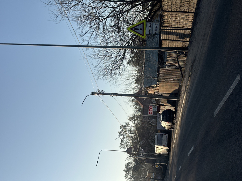 This image captures a street scene in Hostomel, Ukraine, under a clear blue sky. The asphalt road in the foreground features solid and broken white line markings. To the left, a white van or minibus and a dark-colored pickup truck are parked off the road. Behind these vehicles, a building displays a red sign with the Cyrillic letters "СТО" (STO). Further left, two streetlights with curved arms are visible. On the right side of the road, a wooden fence, constructed with varying panel designs, runs parallel to the street. Behind the fence, several buildings with pitched roofs and bare deciduous trees are present. A tall, thin metal pole stands prominently on the right. Attached to another pole near the fence is a yellow triangular warning sign with a red border, depicting an exclamation mark, two vehicles, and the text "↑ 1KM ↑". Multiple utility wires are strung overhead, connecting various poles across the scene. The lighting suggests a low sun angle, casting long shadows from the fence and trees onto the road, indicating either morning or late afternoon. No individuals are visible.