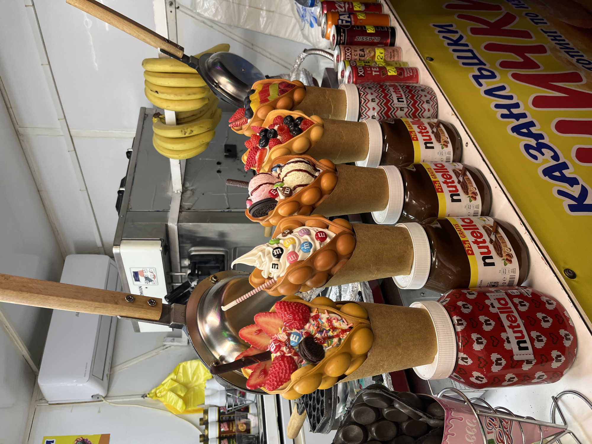 close-up of a dessert stall in what appears to be a street food setting