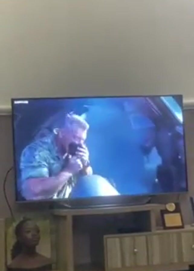 A television displays a video of a futuristic vehicle flying in a cloudy environment. The vehicle appears to be damaged and catching fire. The television is on a wooden stand, which has a picture of a young woman and a plaque on it. The room is fairly simple with a plain white wall and a grey carpet.