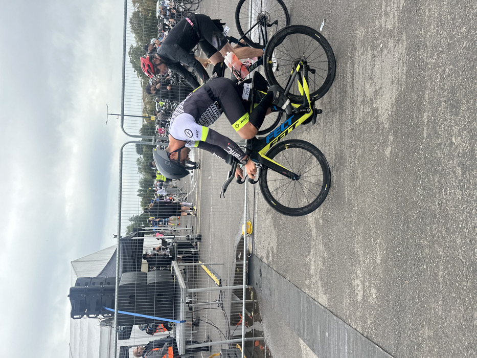 The image displays an outdoor event scene in Weymouth, United Kingdom, characterized by an asphalt surface and an overcast sky. In the immediate foreground, two male cyclists are positioned on their bicycles. The first cyclist, on the left, wears a black, white, and yellow long-sleeved aerodynamic cycling suit, a black helmet, and glasses. He is on a black and yellow Felt time trial bicycle with disc wheels, leaning forward with hands on the aerobars. A race number "2018" is affixed to his seat post. To his right, the second cyclist wears a black long-sleeved top, black cycling shorts, a red helmet, and sunglasses. He is seated on a black road bicycle, which has a bottle containing an orange liquid in a frame-mounted cage. A race number "2021" is visible on his seat post. The midground and background feature event infrastructure. On the far left, multiple black sound system speakers are stacked on metal scaffolding, positioned near a large white event tent. Metal crowd barriers run across the scene, separating the immediate area from a gathering of numerous individuals and additional bicycles further back. Some individuals in the background wear high-visibility vests. A dark grey event mat is laid across the asphalt surface in the left mid-ground, adjacent to a visible puddle of water. Distant trees and a street lamp pole are visible against the cloudy sky.
