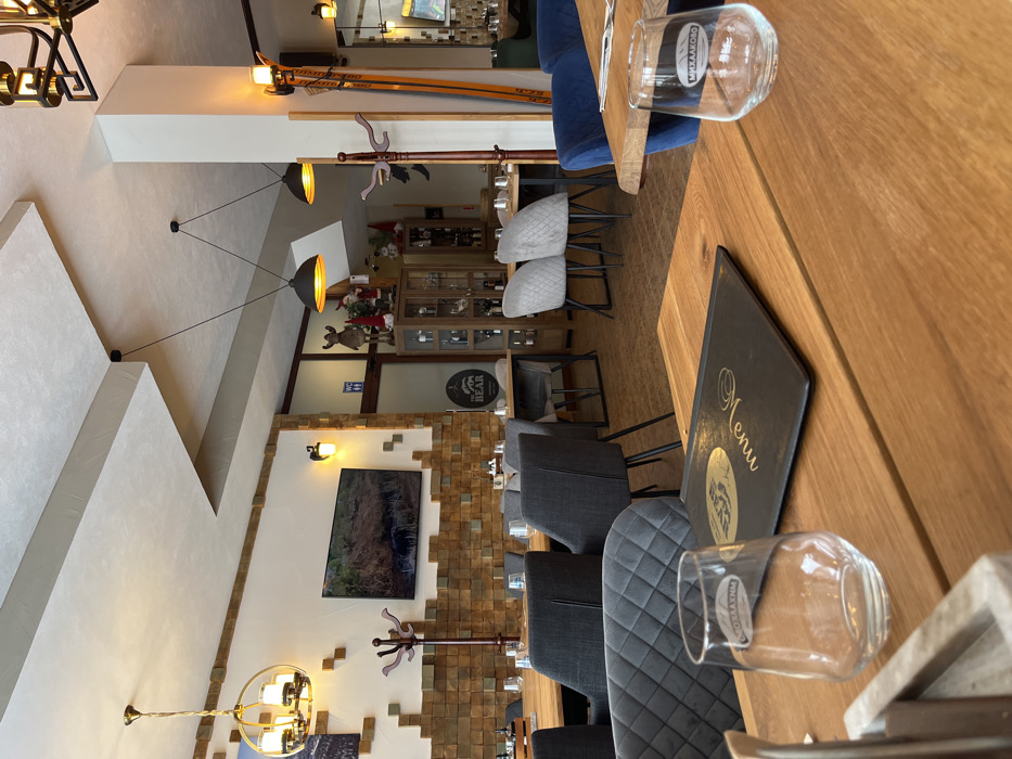 The scene captures the interior of an unoccupied restaurant in Stoikite, Bulgaria. In the immediate foreground, a light-colored wooden table features a black menu folder with gold lettering and a clear, empty drinking glass bearing the "МИХАЛКОВО" brand and a mountain logo. A dark grey quilted chair is positioned to the left. The midground reveals a dining area with multiple light-colored wooden tables and a mix of dark grey and lighter grey quilted upholstered chairs. No individuals are present. The left wall displays a patterned design of light brown wooden blocks, above which a flat-screen television shows a natural landscape. A golden wall sconce and a brown wooden coat rack are on this wall. A golden, multi-tiered chandelier hangs from the ceiling on the left, and two black pendant lamps with golden interiors hang centrally. Towards the rear, a doorway with a "WC" sign leads to another section. Adjacent to this, a tall wooden display cabinet with glass doors is stocked with bottles, topped with decorative figures including a large moose, Santa Claus figures, and gnomes. A circular "BEAR" logo sign is mounted on the wall nearby. On the far right, a pair of vintage-style wooden skis leans against a wall, illuminated by another golden wall sconce. A mirror on the right reflects additional seating. The ceiling features a multi-level design in white and light grey tones.