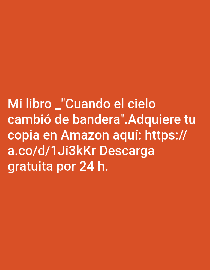 The image displays a promotional message for a book titled "Cuando el cielo cambió de bandera" (When the sky changed its flag). It encourages viewers to purchase a copy on Amazon, providing a shortened URL: https://a.co/d/1Ji3kKr. Additionally, the message highlights a limited-time offer of a free download available for 24 hours. The text is presented in white against a solid orange background.