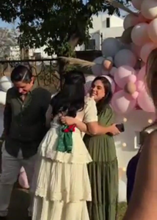 A baby shower is in progress outdoors. Three women and a man are visible, all interacting with each other in the frame. One woman wearing a tiered cream-colored dress is being hugged first by another woman in a green dress and then the man in an olive-colored shirt and white pants. A third woman in a sleeveless blue top is standing nearby, watching the interaction. Behind them is a decorative balloon arch in pink and white colors with a white cutout house. There is also a fence, a tree, and a white house visible in the background. The ground is grassy.