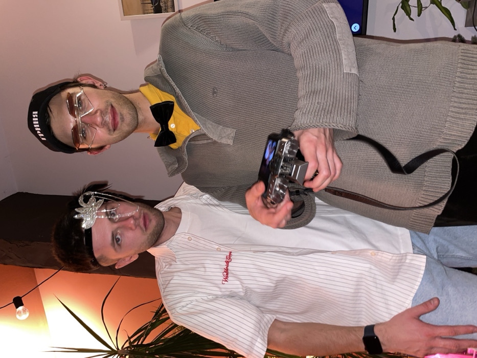 Two men pose indoors for a photo. The man on top wears glasses, a hat, a yellow shirt, and a brown bow tie. He's behind the other man, wearing a light striped shirt and a sequined headband. The top man holds a camera with a strap. A plant and light fixture are visible in the foreground. In the background, a TV is mounted on the wall with a picture frame above it.