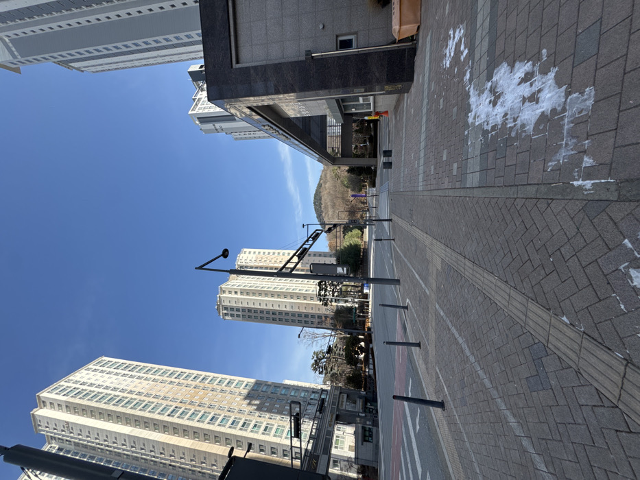 A low-angle perspective of a city street shows tall apartment buildings against a bright blue sky