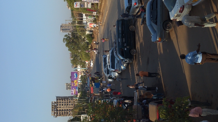 An outdoor street scene with vehicles and people. Cars and a minivan are parked along the side of the road. People are walking and standing around the vehicles. There are buildings visible in the background on the left side, with some billboards and advertisements. The sky is clear and blue.