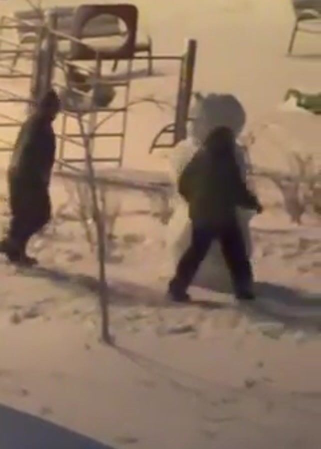 In a snowy outdoor setting, two figures are interacting with a snowman. The figure on the left, dressed in dark clothing, stands near a metal jungle gym-like structure and appears to be using a stick or pole to adjust the snowman. The figure on the right, also in dark clothing, stands by the snowman with their arm outstretched, seemingly participating in the construction or adjustment of the snowman. The background features several cars covered in snow and playground equipment, adding to the wintry atmosphere. The scene is captured from a high-angle perspective.