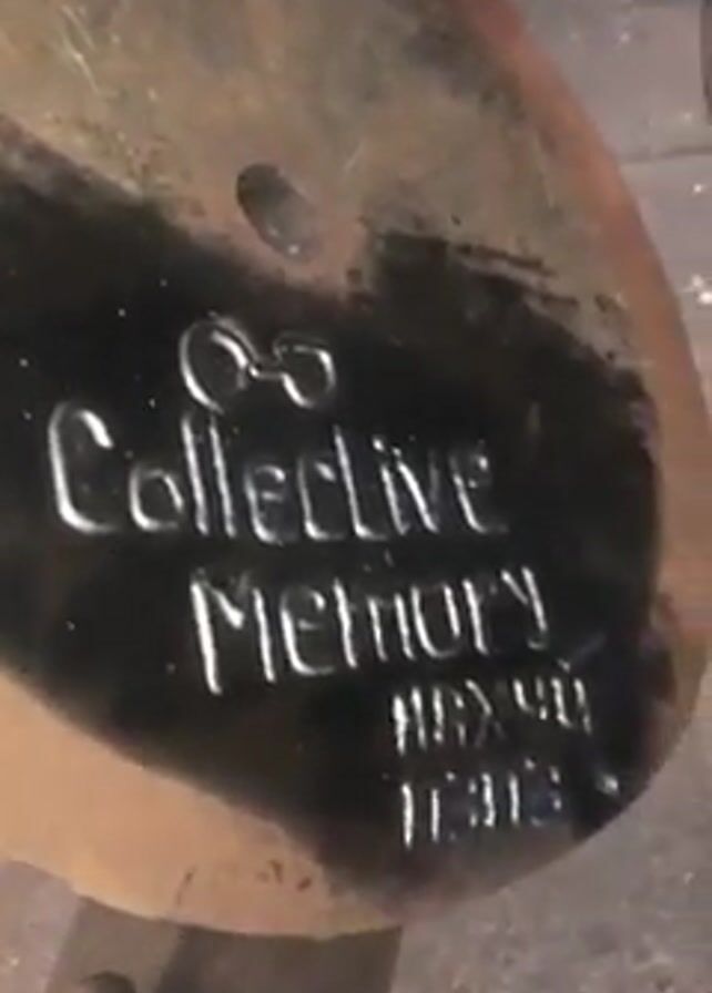 A person is seen placing a metal disc into a metal bucket. The disc is inscribed with the words "Collective Memory". The bucket has a green, red, and blue color scheme. The environment appears to be a workshop or storage area, with various tools and metal objects visible in the background.