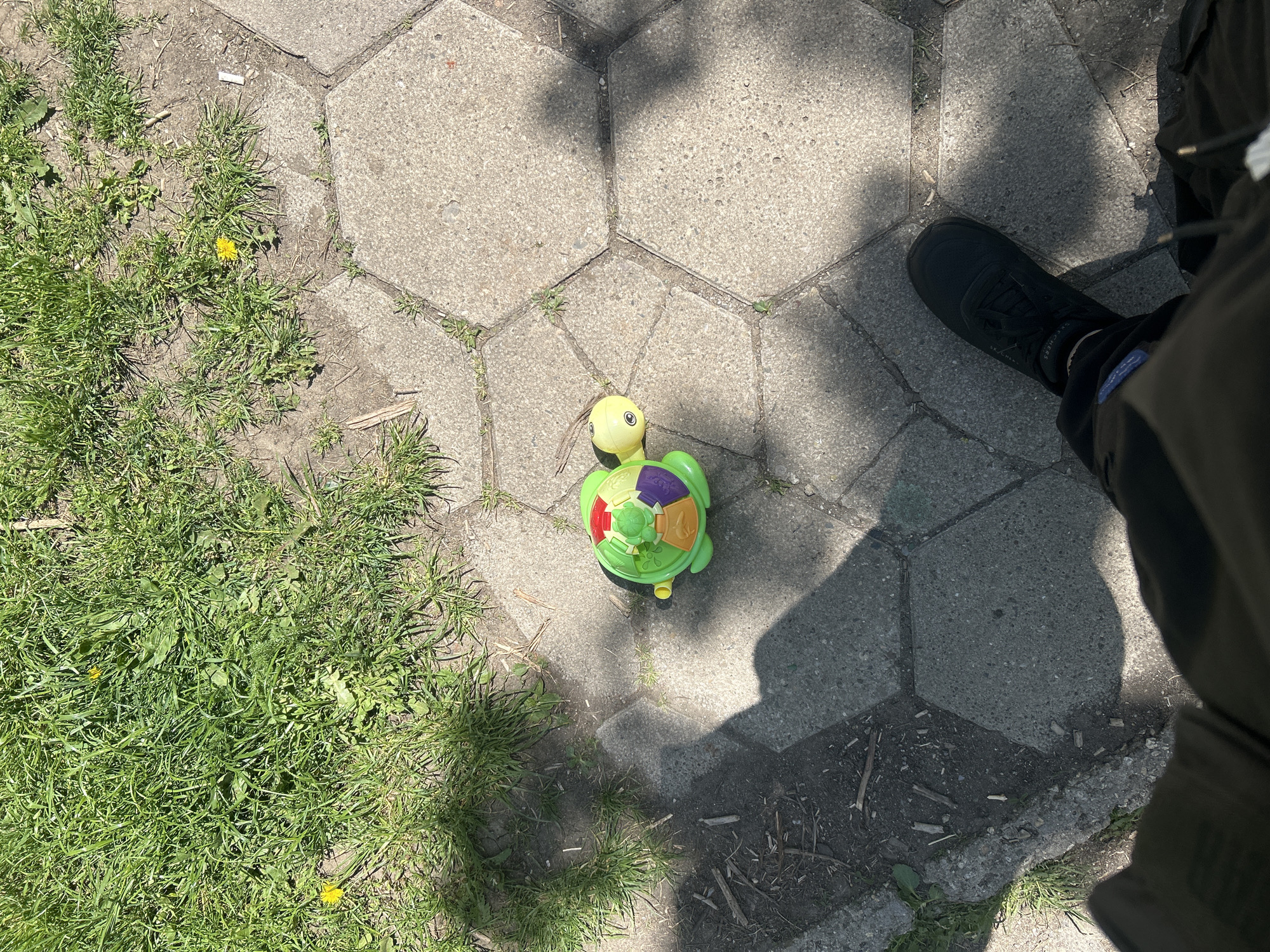 - "The image depicts a sunny outdoor scene, partially shaded, with a child's toy turtle sitting on a hexagonal paved surface adjacent to a patch of green grass with dandelions" by FM-CaKtf1, licensed under CC BY 4.0
