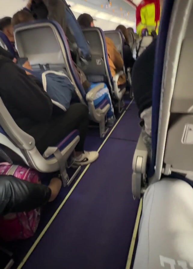 interior of an airplane. Passengers are seated in rows, visible from the aisle. A person wearing a red jacket and neon yellow vest is walking up the aisle. The camera is positioned behind a seat, offering a view of the aisle and the passengers in the surrounding seats. A purple carpet runs down the aisle. The lighting is bright, and the interior appears clean.