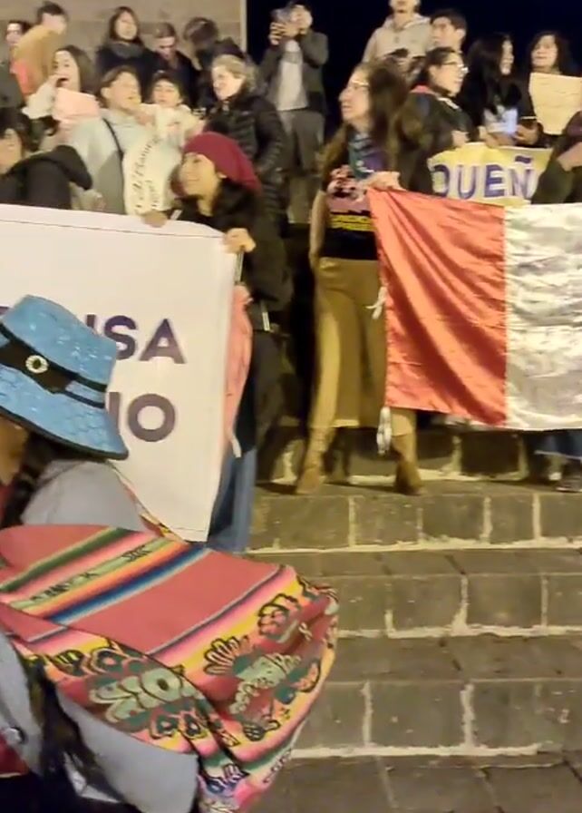 A group of people are gathered on stone steps in front of a building at night. Many people are holding up a white banner that reads “CUSCO EN DEFENSA DEL CINE PERUANO” in purple text. They also hold up the Peruvian flag. Some people are taking photos or videos of the demonstration. A woman in the foreground is wearing a blue hat and a colorful shawl.