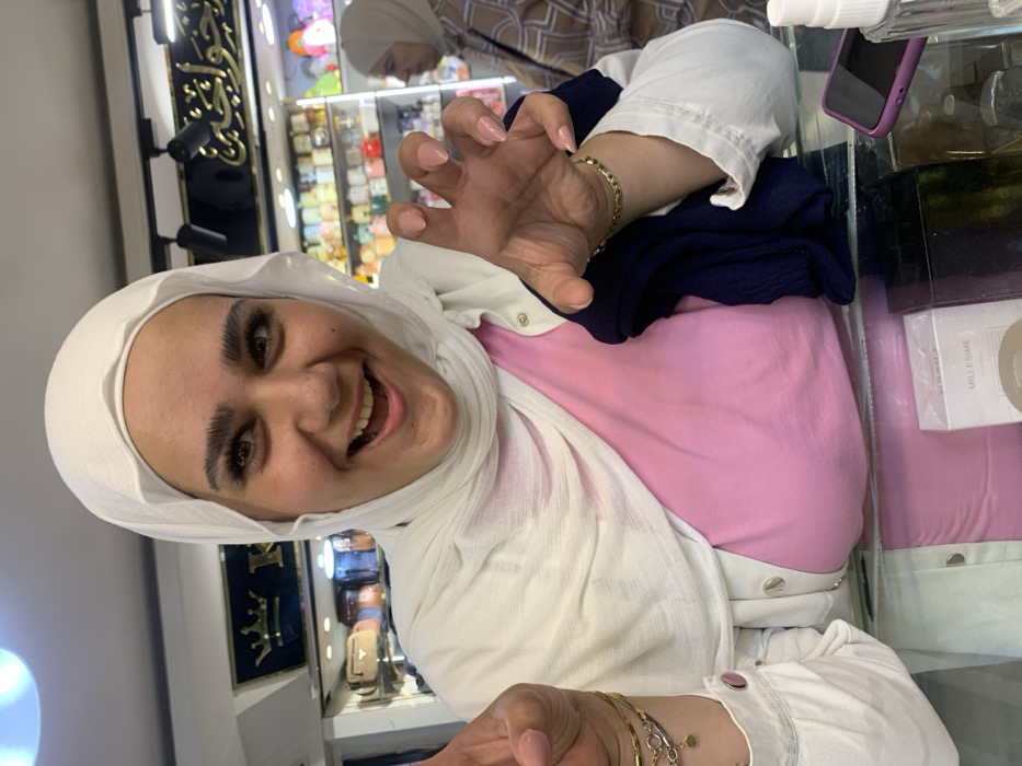 The image displays an indoor scene within a retail establishment situated in Barza Municipality, Syria. The primary subject is a female, positioned in the foreground behind a clear counter, facing the camera. She wears a white hijab, a pink top, and a white cardigan. Her facial expression shows a wide, open-mouthed smile with visible teeth, and wide eyes. Her right hand is raised and fingers are curled into a "claw" gesture, featuring elongated, light pink manicured nails. A gold-toned chain bracelet is on her right wrist, and a dark blue fabric is held near her right forearm. Her left wrist, partially visible, displays multiple thin bracelets, including gold and silver-toned varieties with small charms. On the glass counter directly in front of the subject, a white box labeled "MILLESIME," a purple smartphone, and a clear spray bottle are present. The background consists of illuminated shelving units stocked with various items, including numerous colorful mugs or small decorative objects. A dark sign with gold Arabic script, identifying the store as "لوازم العروسين" (Wedding Supplies/Bridal Necessities), is mounted above the shelves on the right side. Another dark sign featuring a gold crown and the letter "K" is visible to the upper left. A second female, wearing a light-colored hijab, is partially visible in the far right background, facing away from the camera. The environment indicates a well-lit shop specializing in gifts, household goods, or bridal items.
