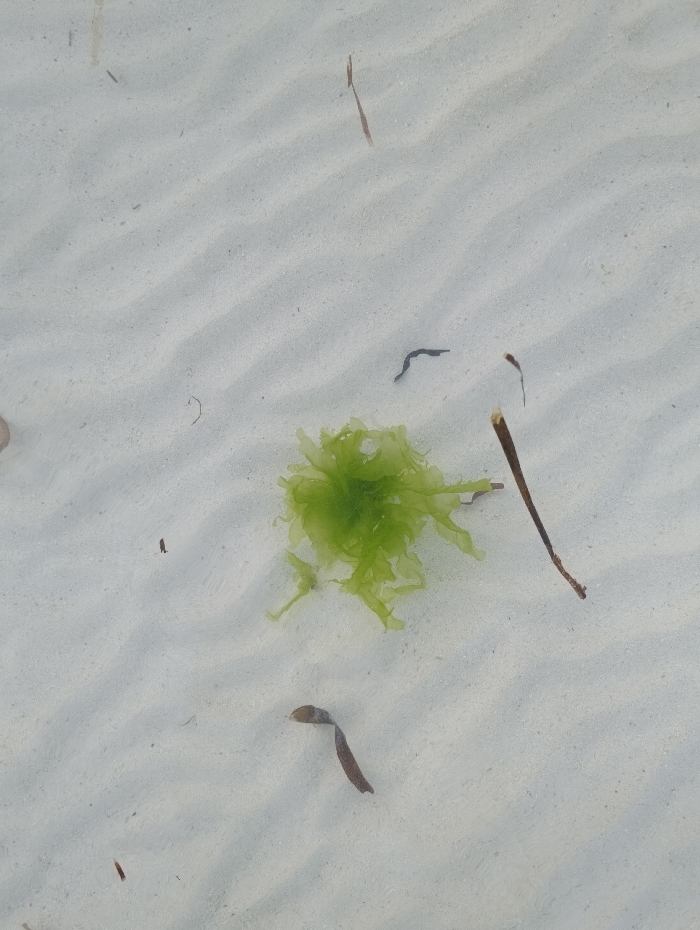 The image displays a submerged sandy environment within the Makadara/Mji Wa Kale ward, Kenya. The substrate consists of light-colored sand exhibiting subtle ripple patterns. A central cluster of bright green, ruffled marine algae is prominent. Scattered across the sand are several pieces of dark brown detritus, varying from elongated, stick-like fragments to flatter, irregular organic material. The water appears clear, providing an unobstructed view of the seabed. No animate subjects, human-made objects, or specific actions are visible.